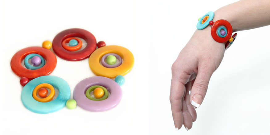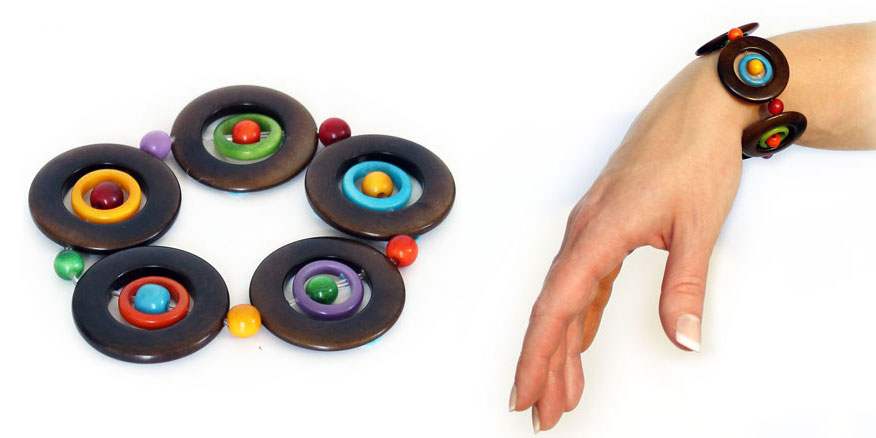This fabulous bracelet is a composition of concentric circled-shaped tagua beads combined with mini tagua spheres on each center, making up a playful combination of shape and color. Elastic cord. Ethically handmade in Colombia using eco friendly dyes.