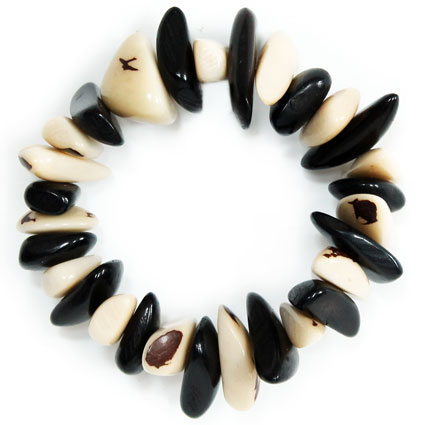 A cluster of chunky tagua fragments, skin still on the edges, make up this cool bracelet. Linked on an elastic band and a bold statement piece for any occasion. This tagua bracelet is fair trade and ethically handmade in Colombia.