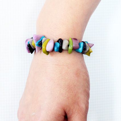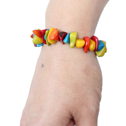 Multicolor tagua fragments are clustered along an elastic cord that wraps around your wrist. All the beads used are sustainable, organic, vegan and biodegradable: 100% vegetable ivory (Tagua seeds). This tagua bracelet is fair trade and ethically handmade in Colombia using eco friendly dyes.