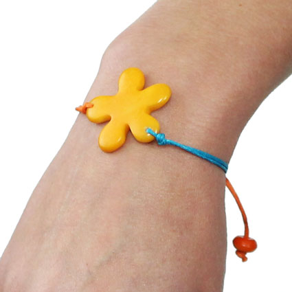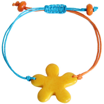 A single rounded star attached to a double adjustable cotton cord. Playful, colorful and fun. This Tagua bracelet is fair trade and ethically handmade in Colombia using eco friendly dyes.
