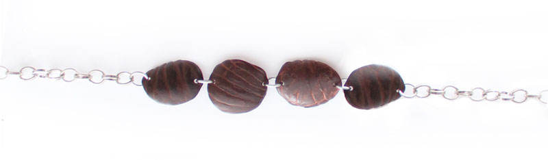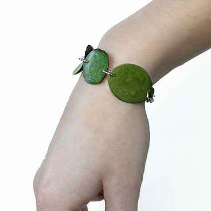 A gorgeous bracelet composed of four thinly sliced tagua rinds linked on an adjustable chain. Each husk has a natural textured brown finish on one side and is polished and dyed green on the other, making it reversible and versatile. When the Tagua seeds are dry, the rind is shaved off, these shavings are dyed green to obtain a gorgeous finish: smooth and green on one side and natural brown textured on the other (making it reversible for versatility). These tagua seeds are sustainable, organic, vegan and biodegradable: 100% vegetable ivory (Tagua seeds). . This tagua bracelet is fair trade and ethically handmade in Colombia using eco friendly dyes.