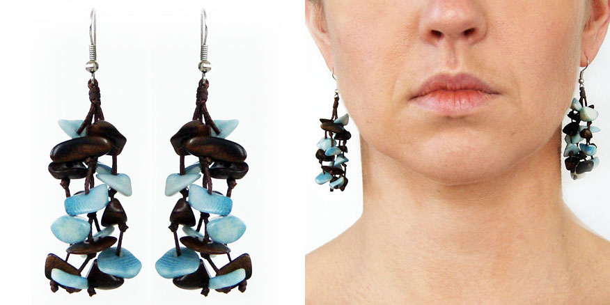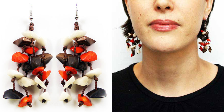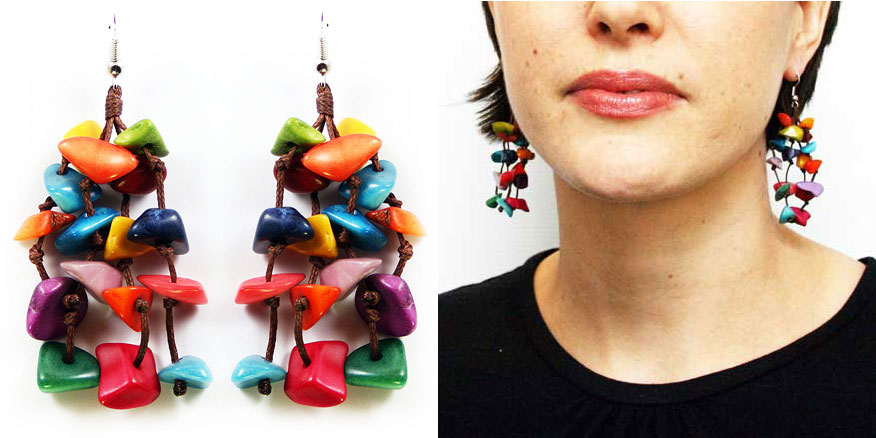 These natural earrings are small shards of tagua hanging from four cotton strings. Playful and stylishly beautiful. Surgical steel findings. These tagua earrings are fair trade and ethically handmade in Colombia using eco friendly dyes.