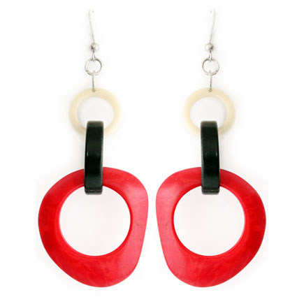 These natural earrings are a perfect trio: two small rings linked together to a bigger, chunkier one to make up a composition of colorful goodness. Playful and stylishly beautiful. Surgical steel findings. These tagua earrings are ethically handmade in Colombia using eco friendly dyes.