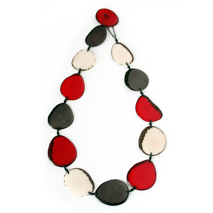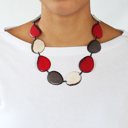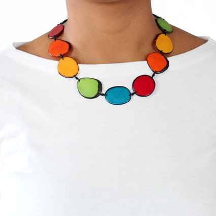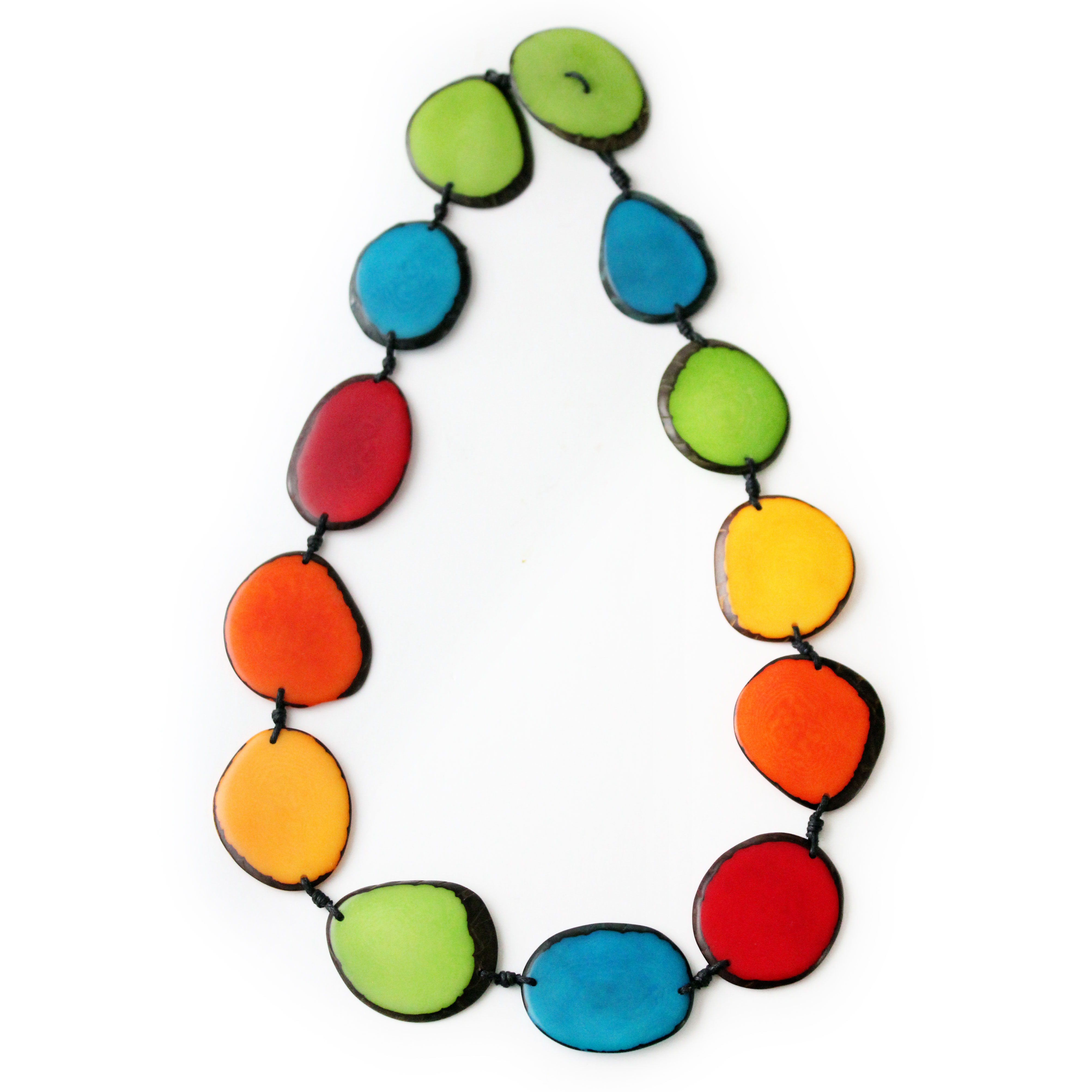 This beautiful design consists of 13 tagua chips with rind on the edges that are linked with cotton cord knots. It is 20 inches long from tip to tip. This tagua necklace is fair trade and ethically handmade in Colombia using eco friendly dyes.