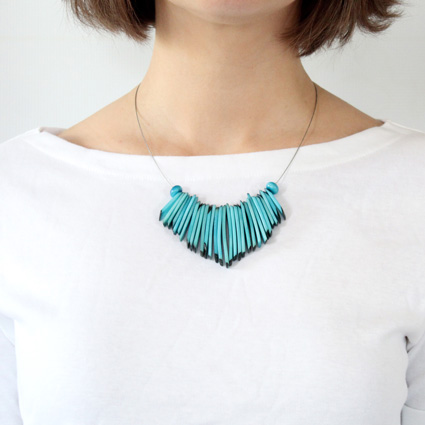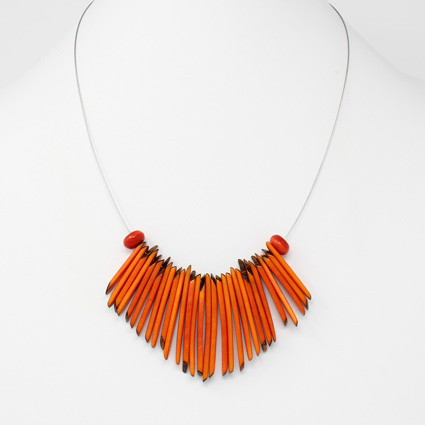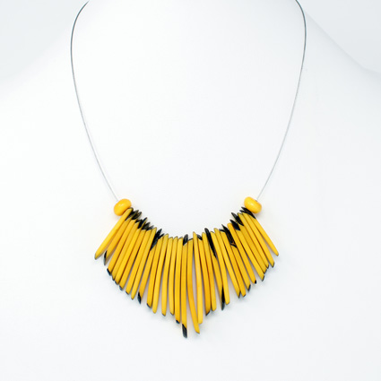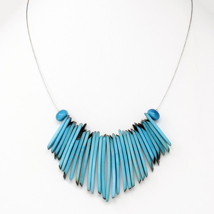 A fringe of rectangular tagua chips with rind on the edges hangs from a steel wire. Two small tagua beads enclose the fringe at the front, and another two finish it off at the back, It is adjsutable for versatility. This tagua necklace is fair trade and ethically handmade in Colombia using eco friendly dyes.