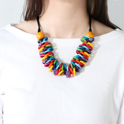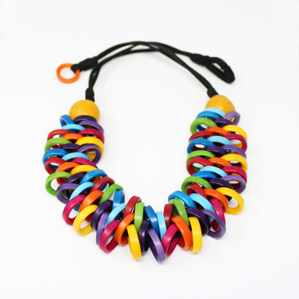 A beautiful composition comprised of two tagua spheres holding three rows of intertwined tagua rings in between two suede cords. It closes at the back with a tagua ring button that inserts into a suede loop, measures 23" from tip to tip. An elegant design that goes well with any outfit. These tagua beads are sustainable, organic, vegan and biodegradable: 100% vegetable ivory (Tagua seeds). This tagua necklace is fair trade and ethically handmade in Colombia using eco friendly dyes.