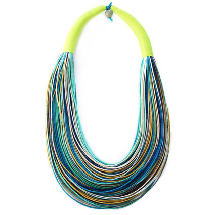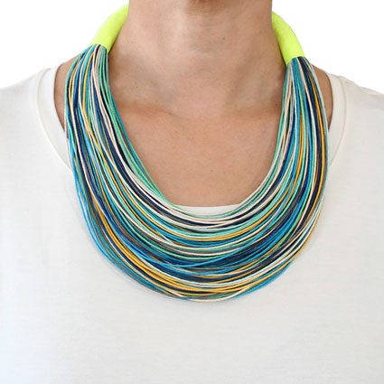 A strand of several organic cotton cords are clustered together to make up this gorgeous necklace. An uncommon, playful and colorful design that goes well with any outfit (11" long). This necklace is fair trade and ethically handmade in Colombia using eco friendly dyes.