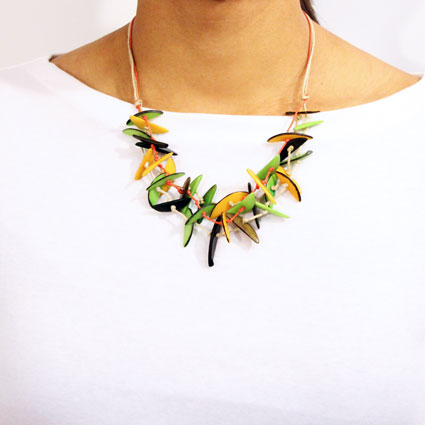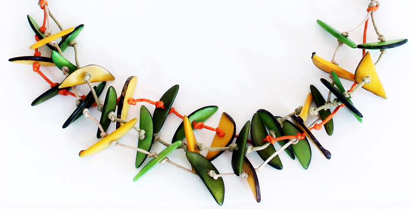 Tagua slivers, with some skin on the edges, are tied together along three cotton strings. Nine inches long. This tagua necklace is fair trade, sustainable, organic, vegan, biodegradable and ethically handmade in Colombia using eco friendly dyes.