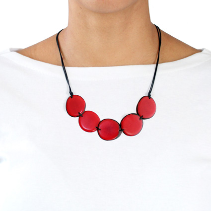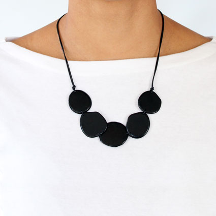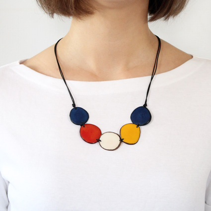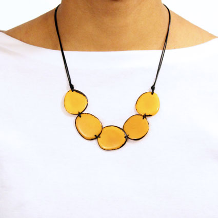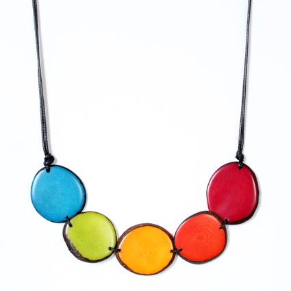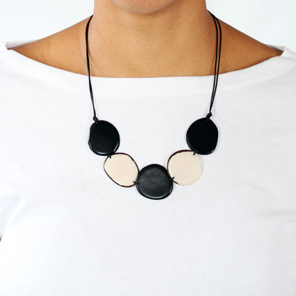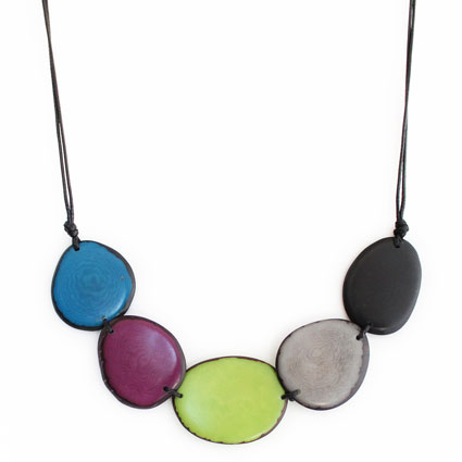 Five tagua chips (with rind on the edges) are tied together with a cotton cord. A macramé in the back makes it adjustable giving it the versatility of being worn long or short (it is 17 inches long at its maximum length). Two Tagua fragments finish it off at the back on each tip. All the beads used are sustainable, organic, vegan and biodegradable: 100% vegetable ivory (Tagua seeds). This tagua necklace is fair trade and ethically handmade in Colombia using eco friendly dyes.