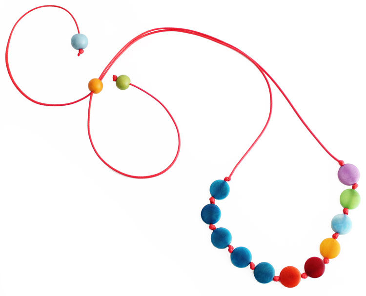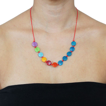 Eleven colorful tagua coins rest along a thin cotton cord. It is 17 inches long and adjustable for versatility. This tagua necklace is fair trade and ethically handmade in Colombia using eco friendly dyes.
