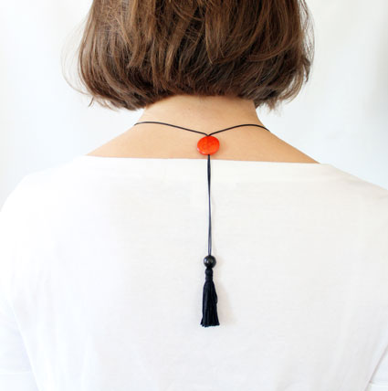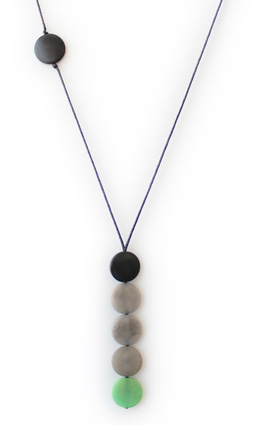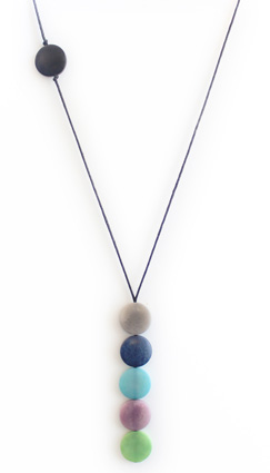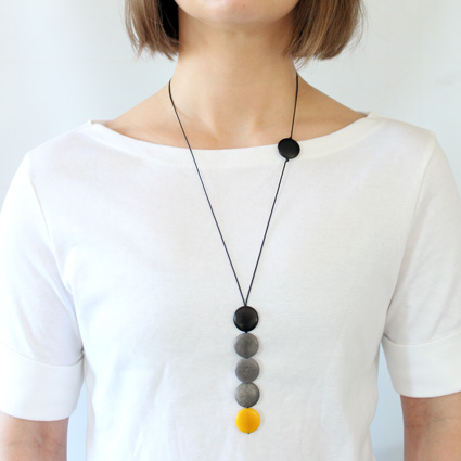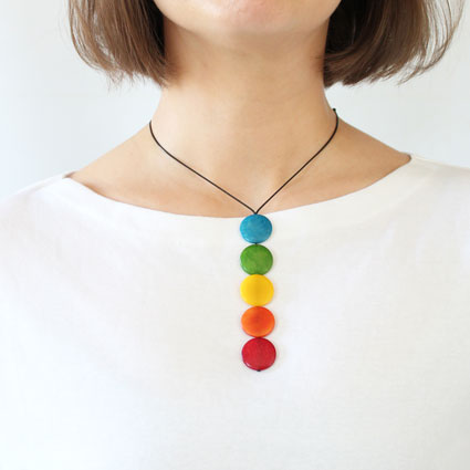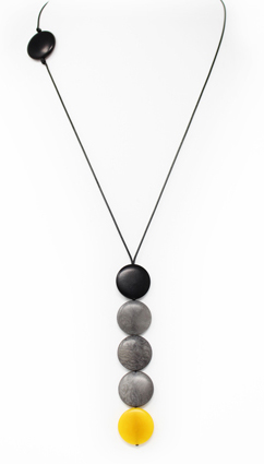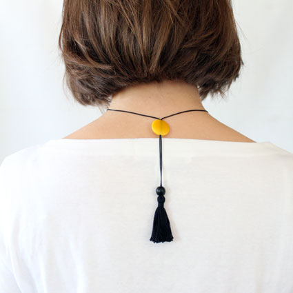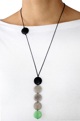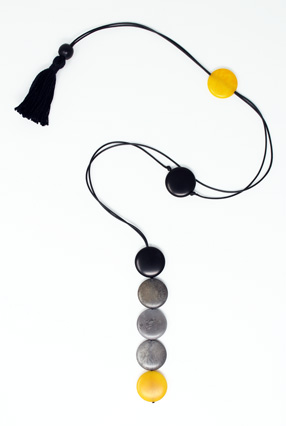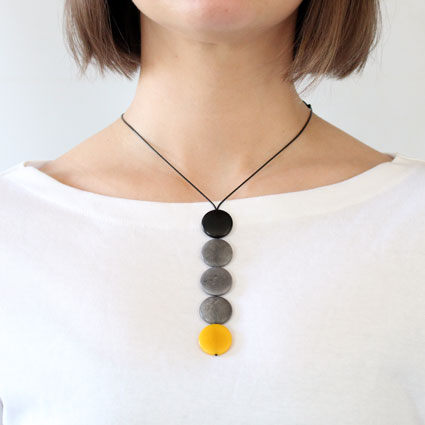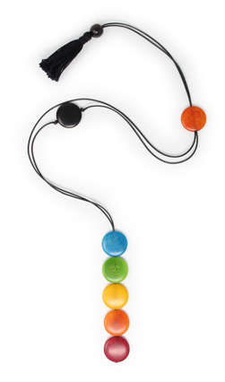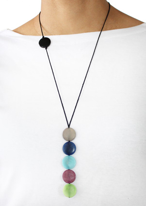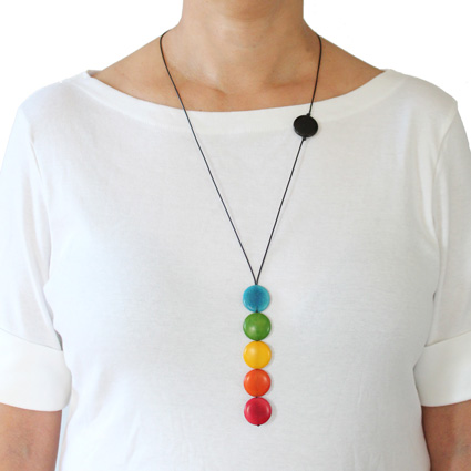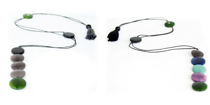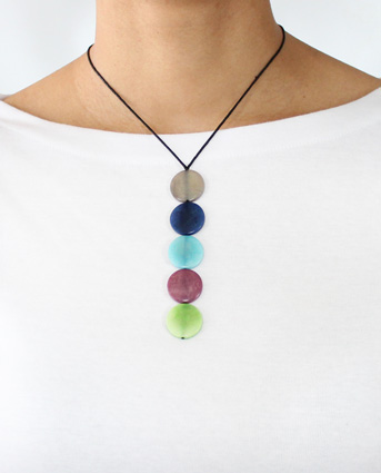 This playful necklace is a single column of five tagua coins hanging from two thin cotton cords. As the cords go up towards the back two more coins appear: a single one on the front and another one on the back used to adjust the length. A tiny tagua sphere holds a small tassel that hangs on the back to finish it off. It is 21 inches long (adjustable). This tagua necklace is fair trade, sustainable, organic and vegan, ethically handmade in Colombia using eco friendly dyes.