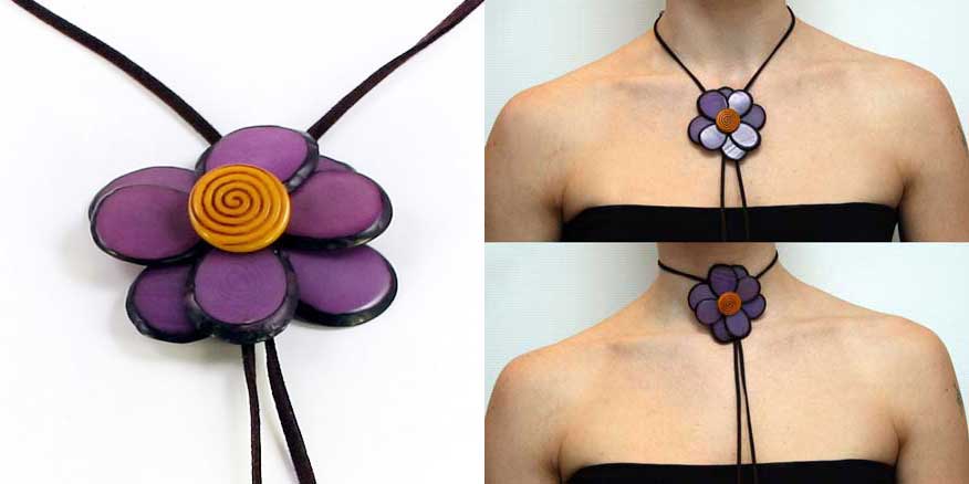 A single, beautiful flower made out of eight delicate tagua chips (petals) tying a single string of faux suede. It is designed to be adjusted in length so it can be a regular necklace or a beautiful choker. Twenty inches long (adjustable). Ethically handmade in Colombia using eco friendly dyes.