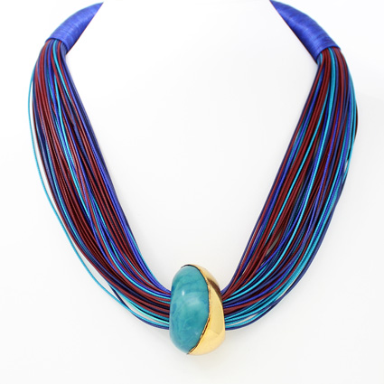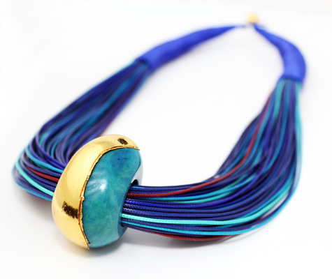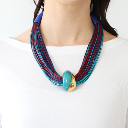 A gorgeous statement necklace from our Luxe Collection: A single whole Tagua seed is drilled through the middle and polished. A gold cast (24k gold-plated brass) is placed through some of its surface creating a fantastic hybrid of natural vegetable ivory and gold in a single piece. This gold-tagua seed hangs from several multicolor cotton strands that are clustered together at the back with a looped string that ends with a tiny gold sphere button for closure. An uncommon, chic design that goes well with any outfit. Tagua seeds are sustainable, organic, vegan and biodegradable: 100% vegetable ivory.