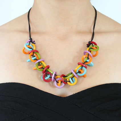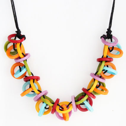 This beautiful necklace is a composition of intertwined tagua rings between two cotton strings. Colorful, playful and stylish. It is adjustable so it can be worn long or short. Ethically handmade in Colombia using eco friendly dyes.