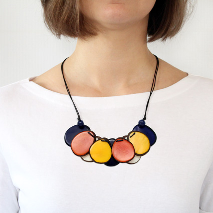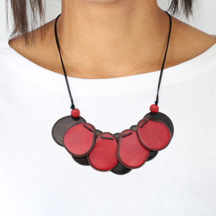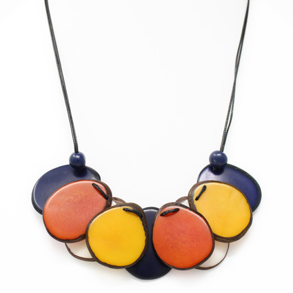 Nine colorful tagua chips with rind around the edges are juxtaposed and intertwined with a cotton cord. An acai seed at the back makes it adjustable for added versatility. All the beads used are sustainable, organic, vegan and biodegradable: 100% vegetable ivory (Tagua seeds). This tagua necklace is fair trade and ethically handmade in Colombia using eco friendly dyes.