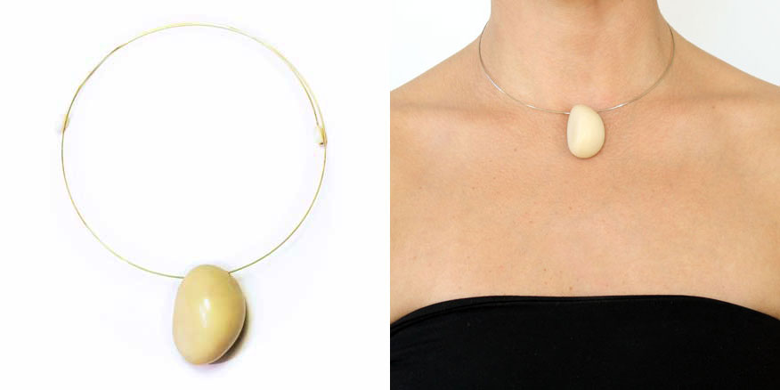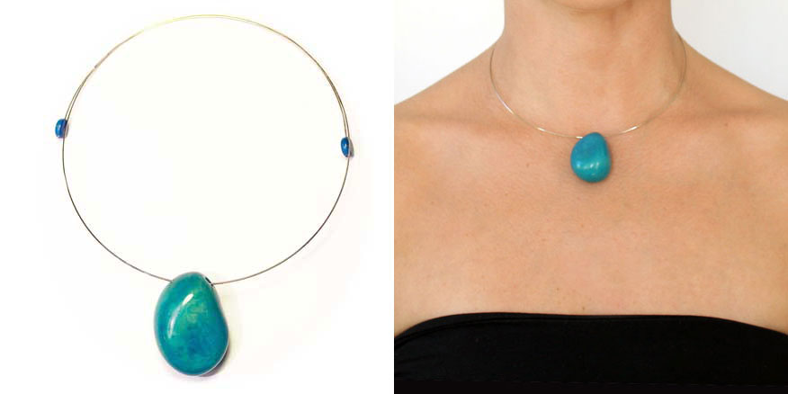 This beautiful tagua choker consists of two elements: a thin stainless steel memory wire that wraps around your neck and a single whole tagua seed that hangs. This tagua necklace is faur trade and ethically handmade in Colombia.