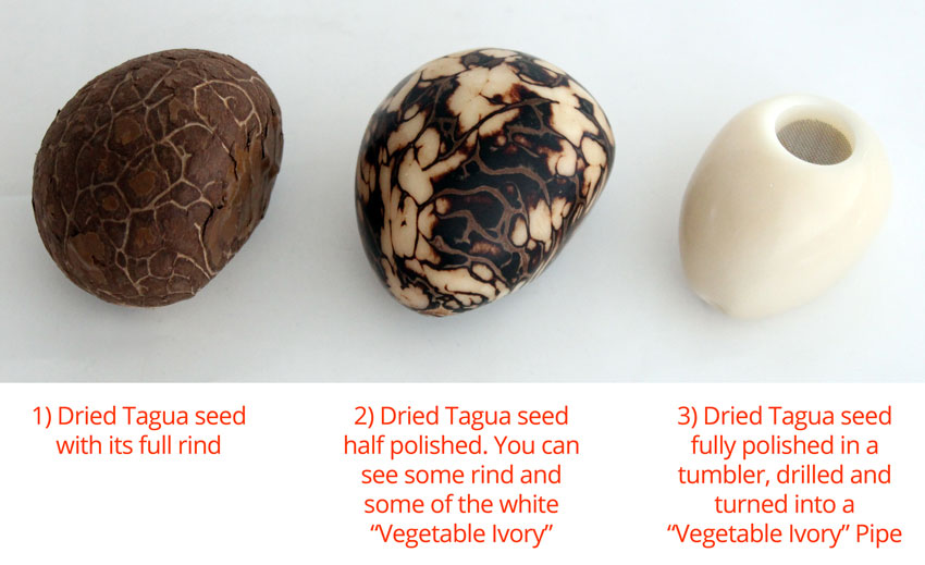 Gorgeous "Vegetable Ivory" pipes hand carved from a whole dried Tagua seed. After the Tagua seeds lose all their moisture they become rock solid and are placed in a tumbler that shaves their brown rind and polishes them until they are completely smooth with their characteristic ivory color and texture. Their texture is silky soft, just like ivory but botanical, similar to worry stones, great to carry around in your pocket or just to have at home. Very chic, practical, unique, and uncommon, makes the perfect gift. These Tagua pipes are sustainable, organic, vegan and biodegradable.