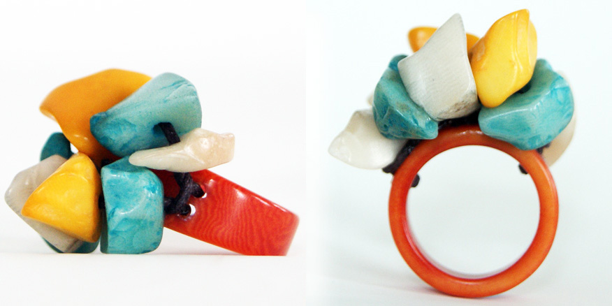 These gorgeous Fair Trade rings are playful and naturally beautiful. A tagua band holds a cluster of colorful tagua bits and shards that are hand sewn together with a cotton cord.