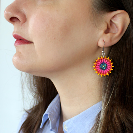 These gorgeous natural earrings are wooden slices laser-etched and painted by hand: Star-shaped mandalas in multicolor, lightweight dangle earrings, uncommon, unique, and beautiful, a rare find to indulge yourself or a thoughtful gift.